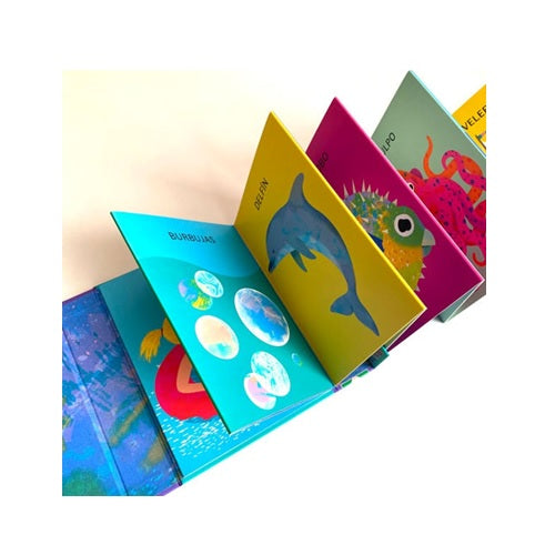 Este precioso libro acordeón presenta a los más pequeños distintos animales y objetos relacionados con el mundo marino. Ponte una máscara de buceo, abre bien los ojos y observa..